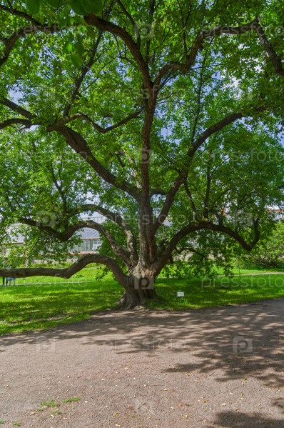 Необычная крона старой яблони - много больших ветвей при отсутствии основного ствола. Парк в ботаническом саду Санкт-Петербурга. Россия. Солнечный день в августе