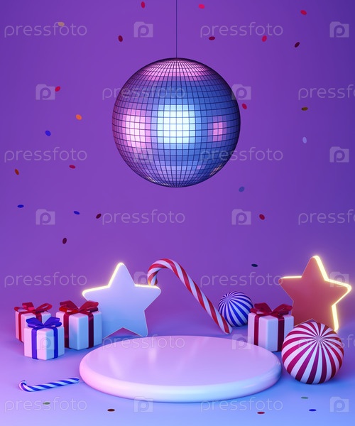 Новогоднее оформление вечеринки с диско-шаром, 3d рендеринг