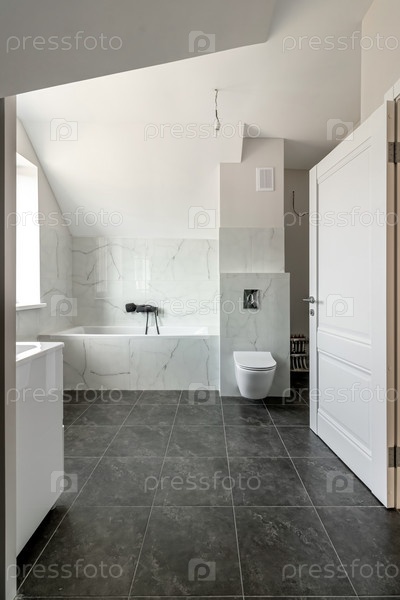 Ванная комната в современном доме с черной керамической плиткой на полу
