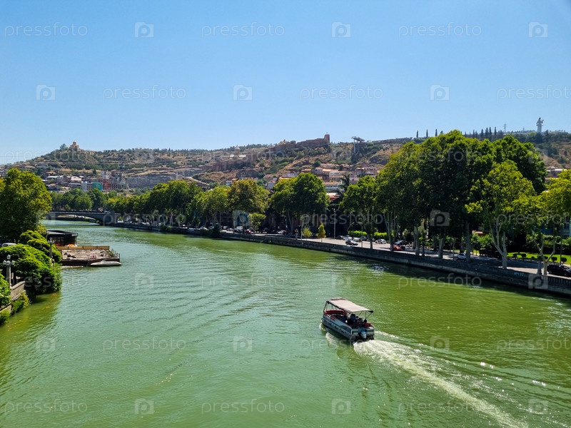 Река Кура в центре Тбилиси в солнечный день. Плывет речной трамвай. Деревья по берегам реки. Зеленая вода. Голубое небо