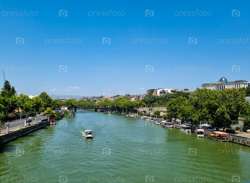 Река Кура в центре Тбилиси в солнечный день. Плывет речной трамвай. Деревья по берегам реки. Зеленая вода. Голубое небо