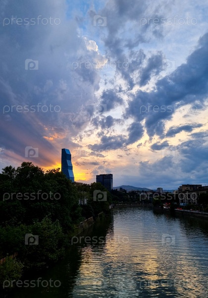 Река кура в центре Тбилиси после заката. Лучи захоящего солнца причудливо проходят сквозь здание. На небе темные облака