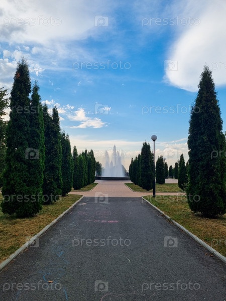 Центральная аллея в парке вдоль которой растут высокие туи, а в конце алле фонтан. Владикавказ
