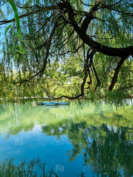 Свежее зеленое озеро в солнечную погоду, над которым нависают ветки ивы и отражается голубое небо. На зеркальной глади озера три лодки. Озеро в парке. Владикавказ. Вертикальное фото