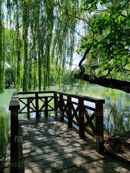 Свежее зеленое озеро в солнечную погоду, над которым нависают ветки ивы и отражается голубое небо. Озеро в парке.Помост над озером. Владикавказ. Ветикальное фото