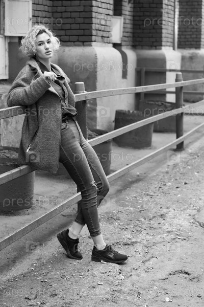 Молодая красивая женщина позирует в пальто на улице, черно-белое фото