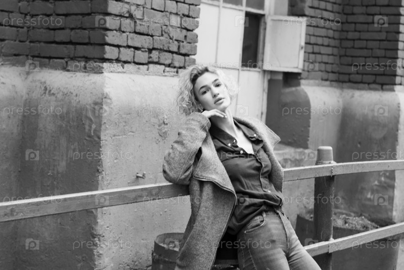 Молодая красивая женщина позирует в пальто на улице, черно-белое фото