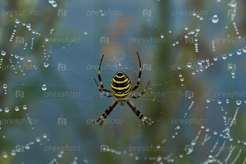 Паук и паутина в росе в сильном тумане на рассвете