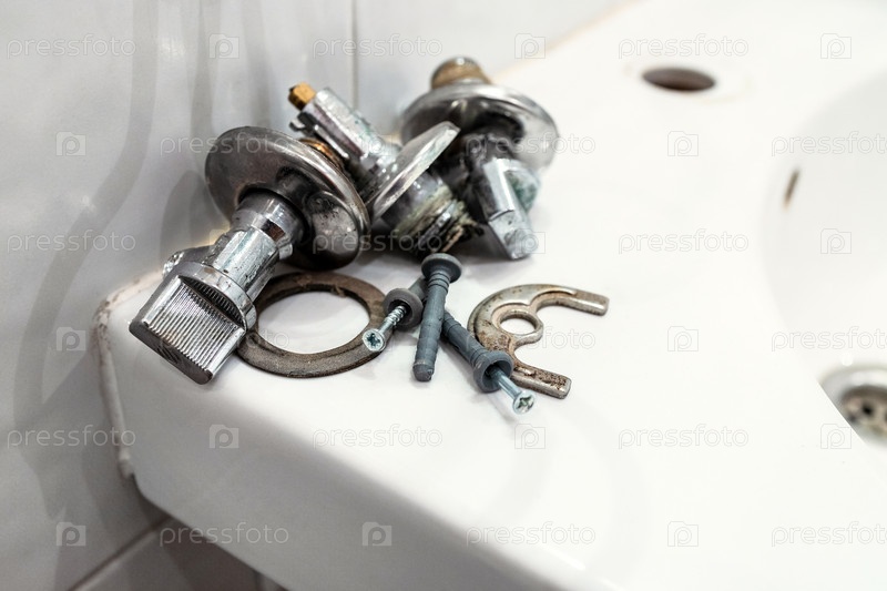 Неисправный шаровой кран и арматура лежат на краю раковины
