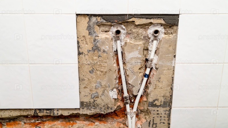 Старый водопровод к крану в стене ванной комнаты
