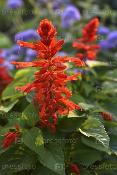 Красные яркие цветы на зеленом кусте в саду. Яснотковые.Шалфей сверкающий – Сальвия блестящая