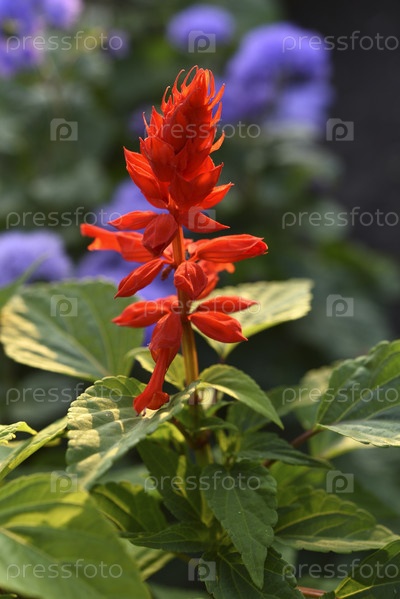 Красные яркие цветы на зеленом кусте в саду. Яснотковые.Шалфей сверкающий – Сальвия блестящая и агератум