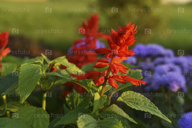 Красные яркие цветы на зеленом кусте в саду. Яснотковые.Шалфей сверкающий – Сальвия блестящая и агератум