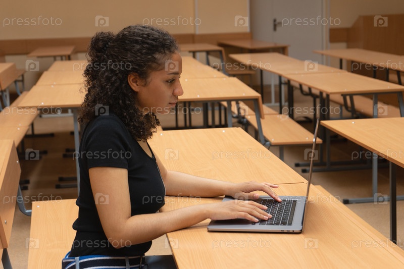 Молодая девушка работает за ноутбуком в университете