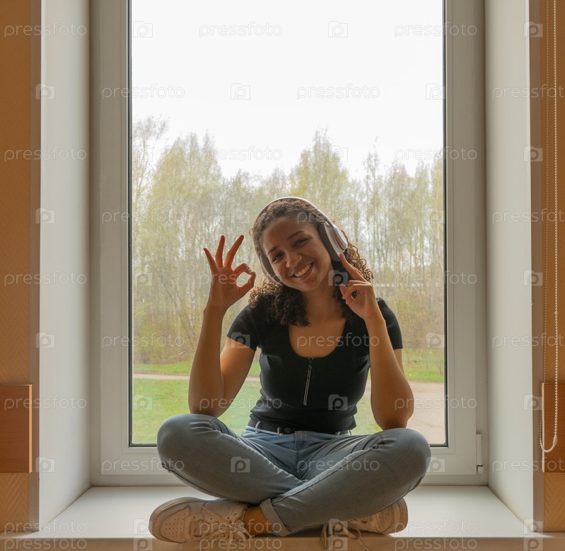 Девушка мулатка на подоконнике в наушниках слушает музыку, показывает ок