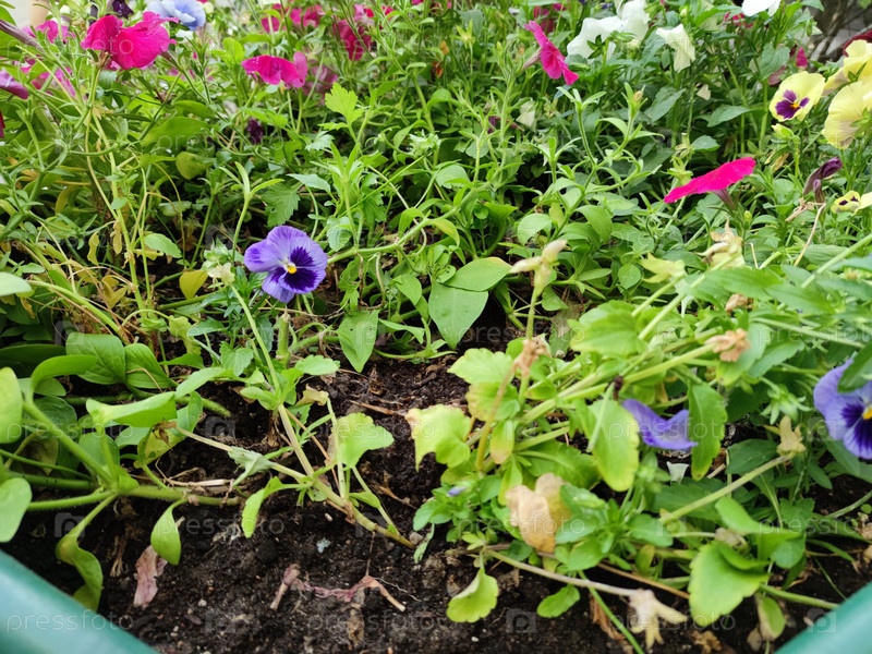Клумба, на которой растут анютины глазки и петунии