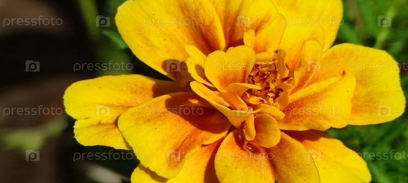 Бархатцы мелкоцветные желто-оранжевые. Цветок крупным планом. Лепестки оранжевые ближе к центру и желтые по краям. Маленькие лепестки цветка посередине и большие снаружи