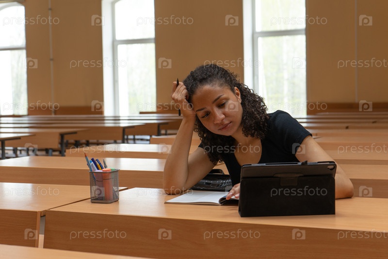 Молодая девушка учится за планшетом в университете