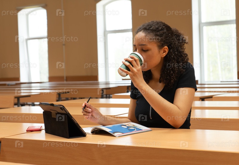 Молодая девушка мулатка пьет кофе за планшетом в университете