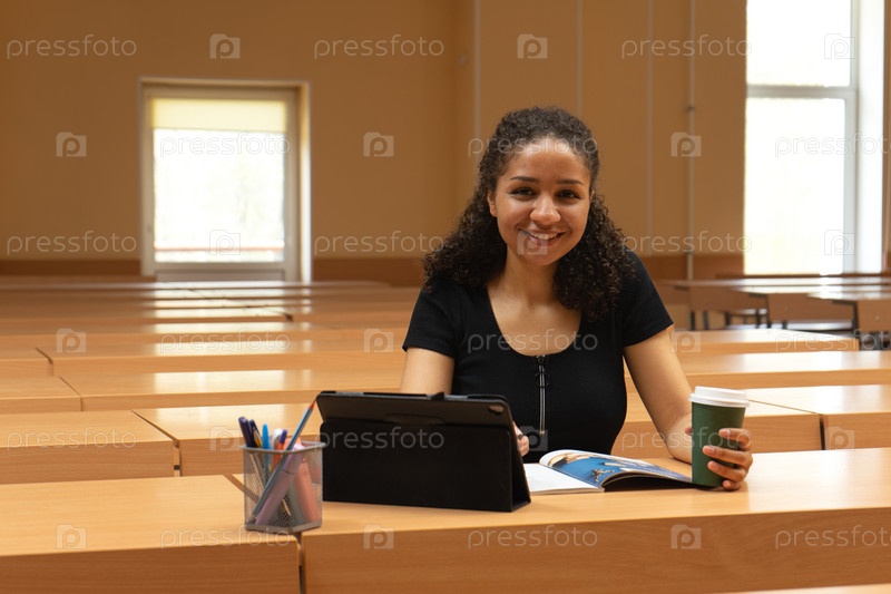 Молодая девушка мулатка пьет кофе за планшетом в университете, улыбается