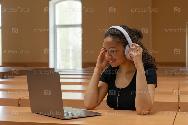 Молодая девушка мулатка в наушниках звонит с ноутбука