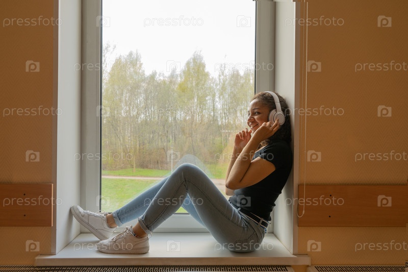 Девушка мулатка на подоконнике в наушниках слушает музыку