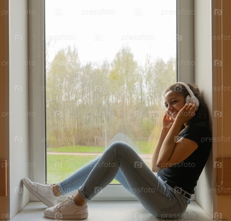 Девушка мулатка на подоконнике в наушниках слушает музыку
