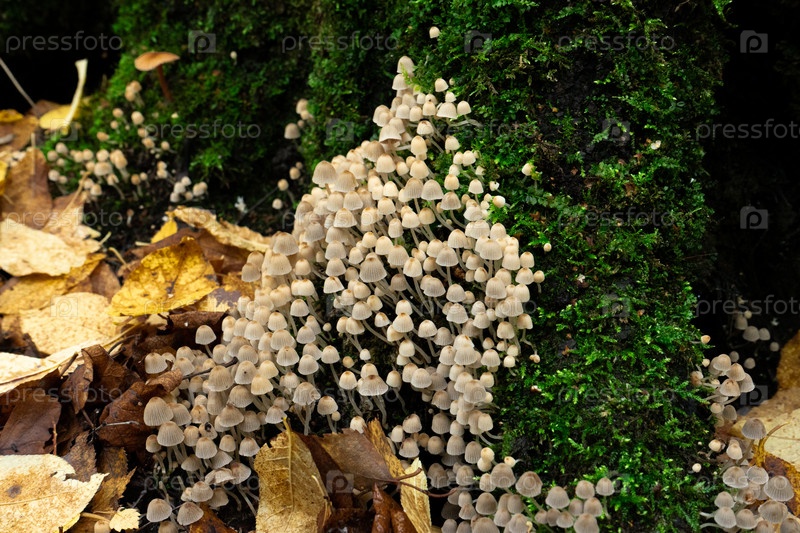 Осенний лес, мох, грибы. рассеянный носитель (Coprinus disseminatus)