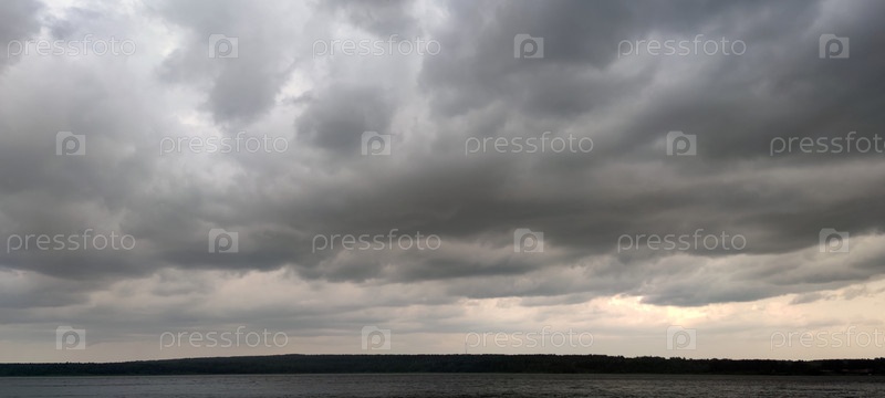 Белые облака над озером. На небе легкие белые полупрозрачные перистые облака, которые раскинулись по всему голубому небу. Под ними находится озеро с небольшими волнами. Лес на другой стороне