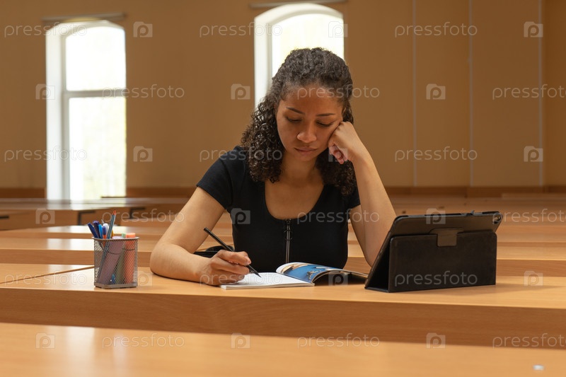 Молодая девушка мулатка учится за планшетом