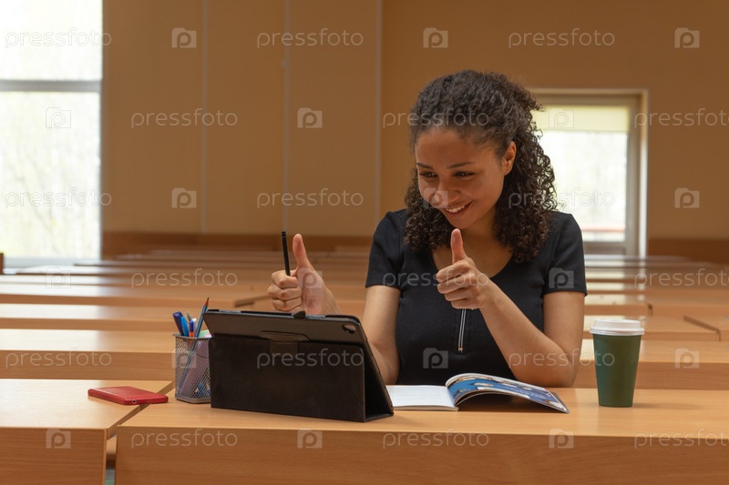 Молодая девушка мулатка пьет кофе за планшетом в университете, показывает класс