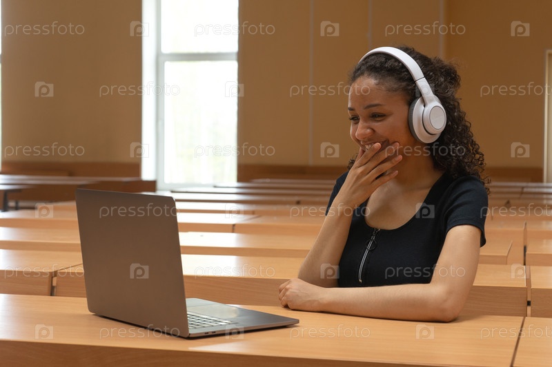 Молодая девушка мулатка в наушниках звонит с ноутбука, улыбается