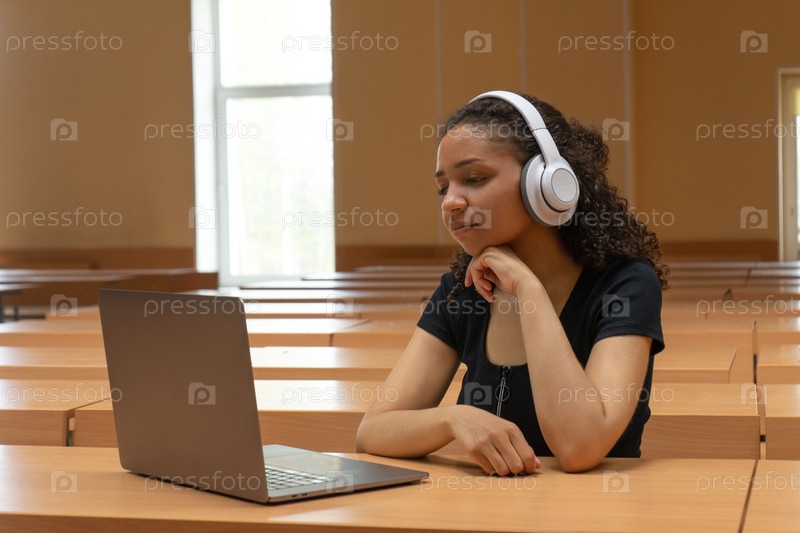 Молодая девушка мулатка в наушниках звонит с ноутбука