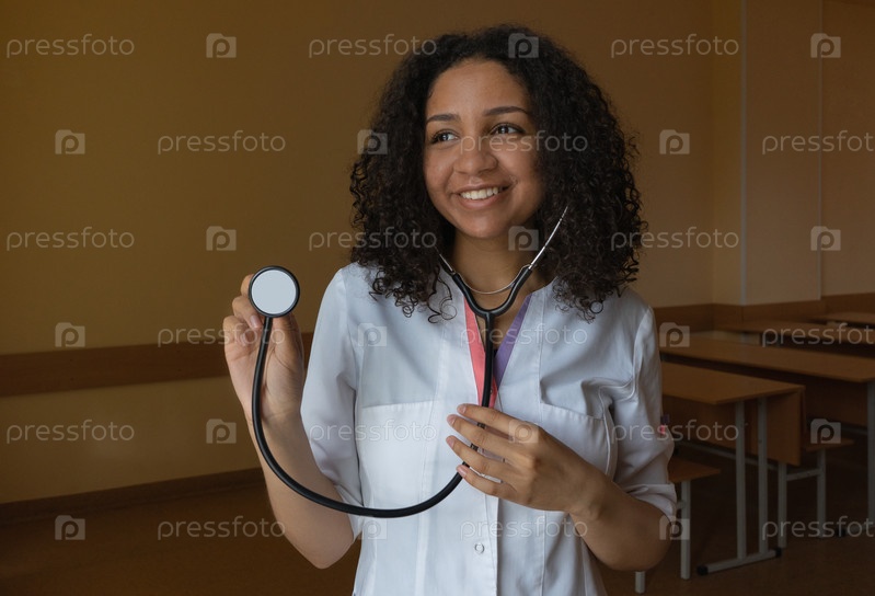 Девушка мулатка медик врач улыбается с фонендоскопом