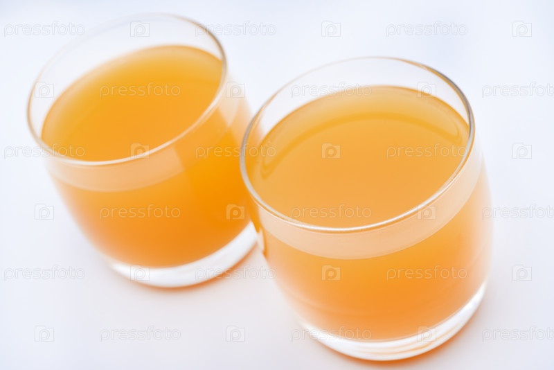 Стеклянные стаканы с апельсиновым соком на белом фоне. Вкусный апельсиновый охлаждающий напиток