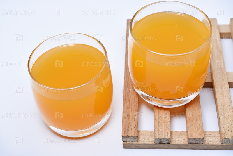 Стеклянные стаканы с апельсиновым соком на деревянной подставке. Безалкогольный напиток в стакане на белом фоне
