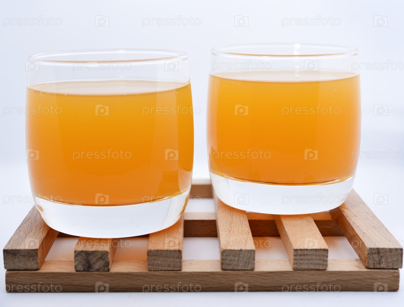 Стеклянные стаканы с апельсиновым соком на деревянной подставке. Безалкогольный напиток в стакане на белом фоне