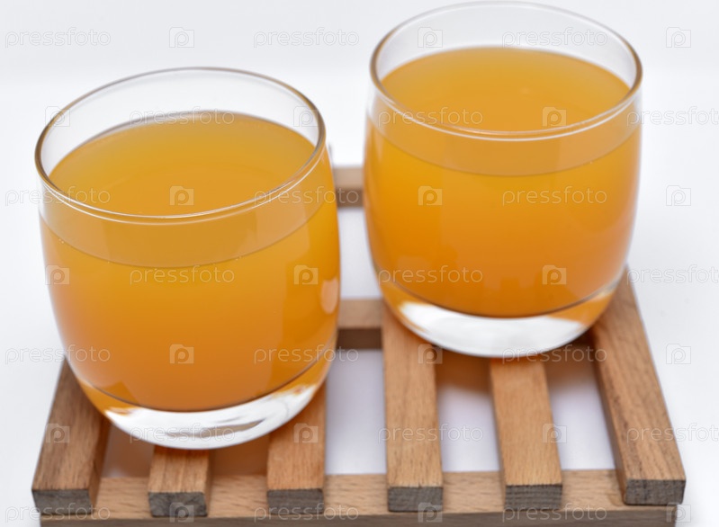 Стеклянные стаканы с апельсиновым соком на деревянной подставке. Безалкогольный напиток в стакане на белом фоне