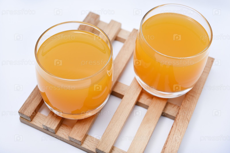 Стеклянные стаканы с апельсиновым соком на деревянной подставке. Безалкогольный напиток в стакане на белом фоне