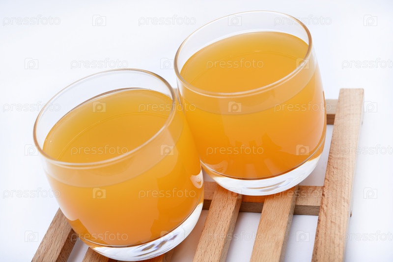 Стеклянные стаканы с апельсиновым соком на деревянной подставке. Безалкогольный напиток в стакане на белом фоне