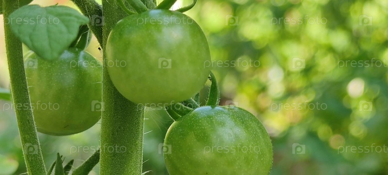 Маленькие помидоры растут на ветке. Еще зеленые помидоры черри висят на ветке томатного куста среди зеленых листьев и стеблей. На ветках и овощах имеются мелкие ворсинки