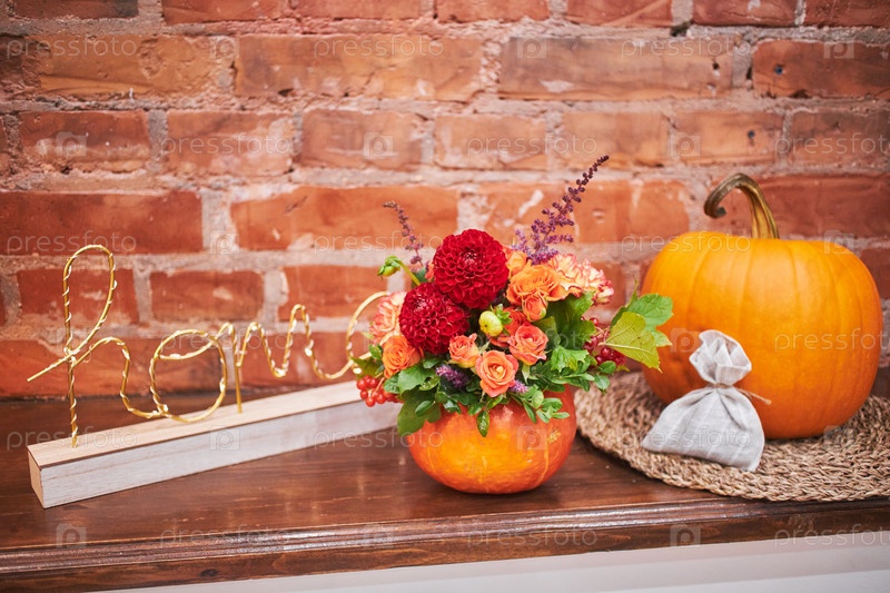 Осенний букет в вазе из тыквы. Красивый цветочный декор на День Благодарения и Хэллоуин. Уютная домашняя атмосфера, осенний декор