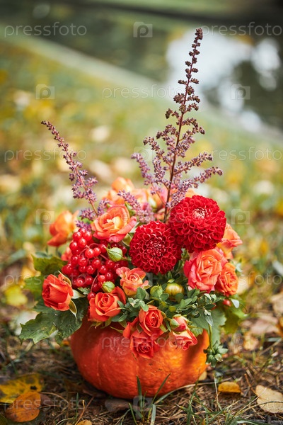 Красивый букет осенних цветов в тыкве на скамейке на открытом воздухе. Красивый цветочный декор на День Благодарения и Хэллоуин. Осенний декор