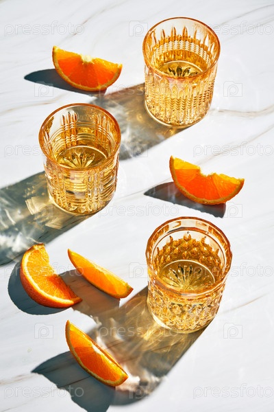 Летние напитки со льдом и апельсинами, лимонадом, алкогольными или безалкогольными коктейлями на светлом столе