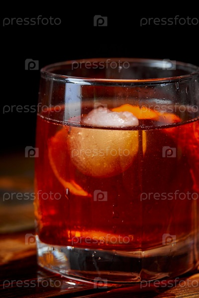 Алкогольный коктейль Негрони или безалкогольный коктейль, напиток со льдом и апельсиновой цедрой в качестве украшения на деревянном столе. Крупным планом
