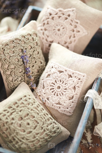 Сумки-саше, украшенные вязанным крючком кружевом и лавандой на деревянном фоне