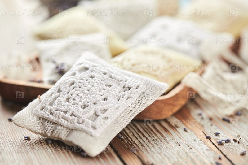 Сумки-саше, украшенные вязанным крючком кружевом и лавандой на деревянном фоне