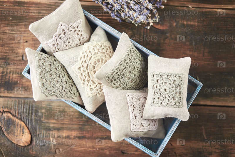 Сумки-саше, украшенные вязанным крючком кружевом и лавандой на деревянном фоне