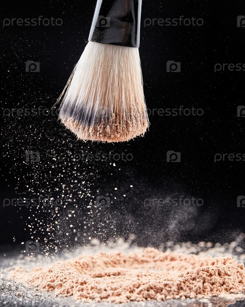 Кисть для макияжа с рассыпчатой косметической пудрой на черном фоне