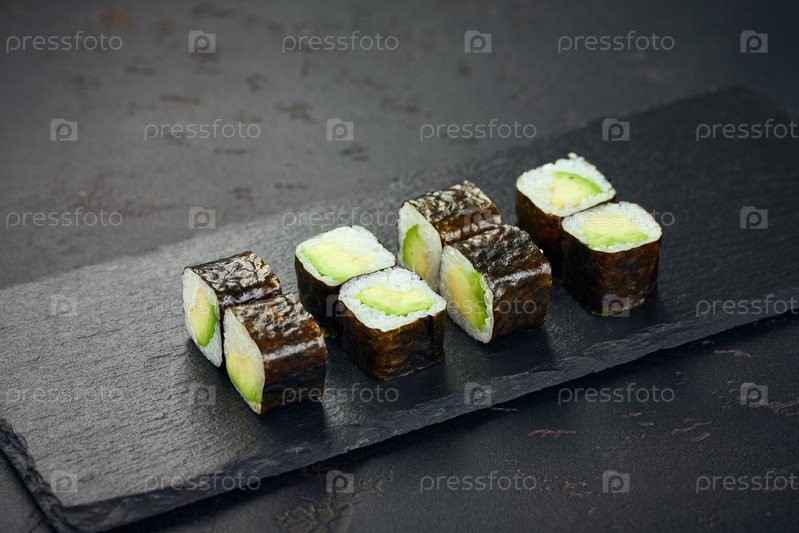 Ролл с авокадо на темном фоне. Суши-меню. Японская еда